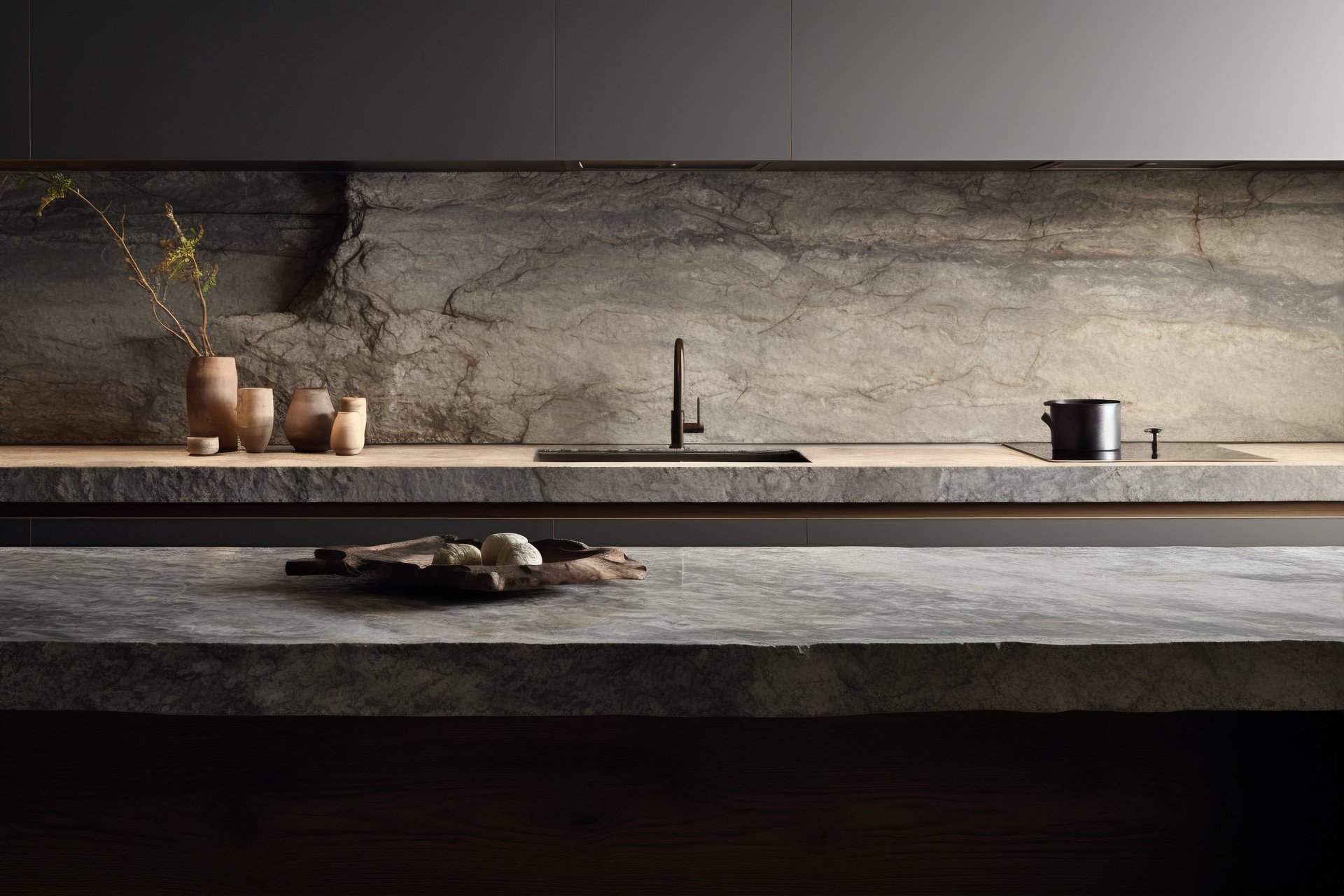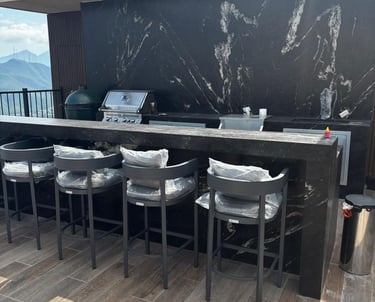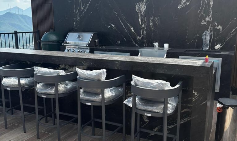 Diseño de barra y cubierta exterior en granito natural, resistente a condiciones climáticas extremas.