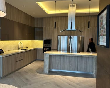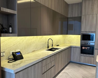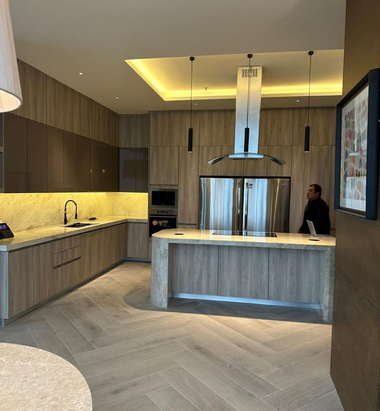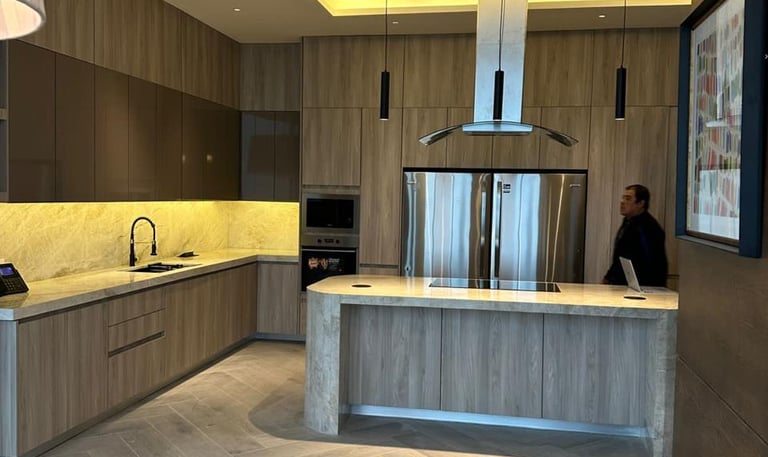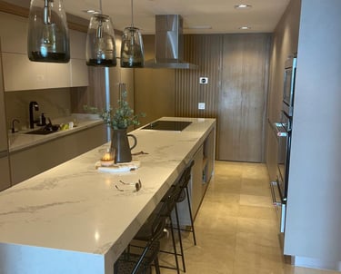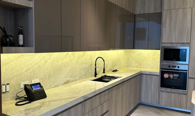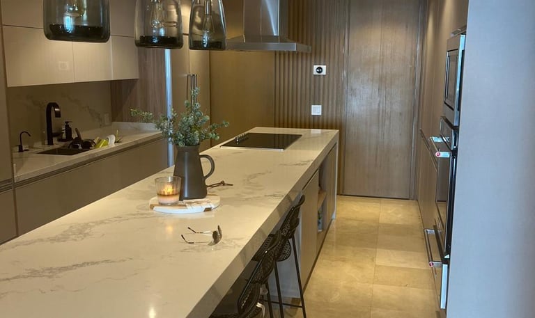 Instalación de cubierta en mármol claro con acabado pulido, integrada a mobiliario moderno en tonos madera.