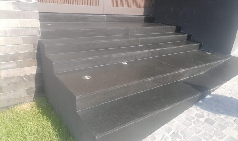 Fabricación e instalación de escaleras en granito negro con acabado mate antideslizante, ideal para exteriores.