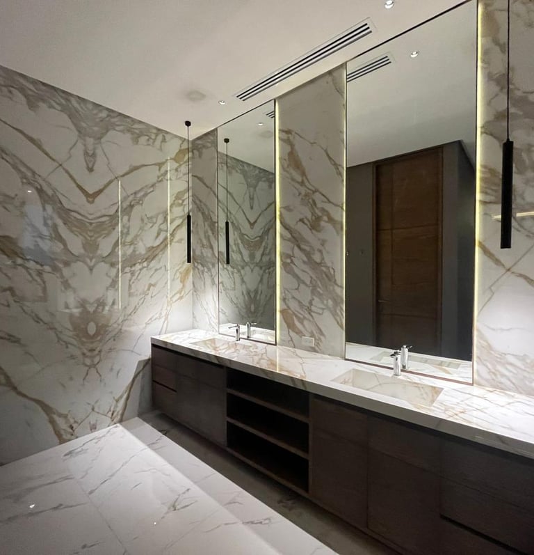 Colocación de placas de mármol natural en área húmeda con sellado antihumedad y juntas alineadas con precisión milimétrica.